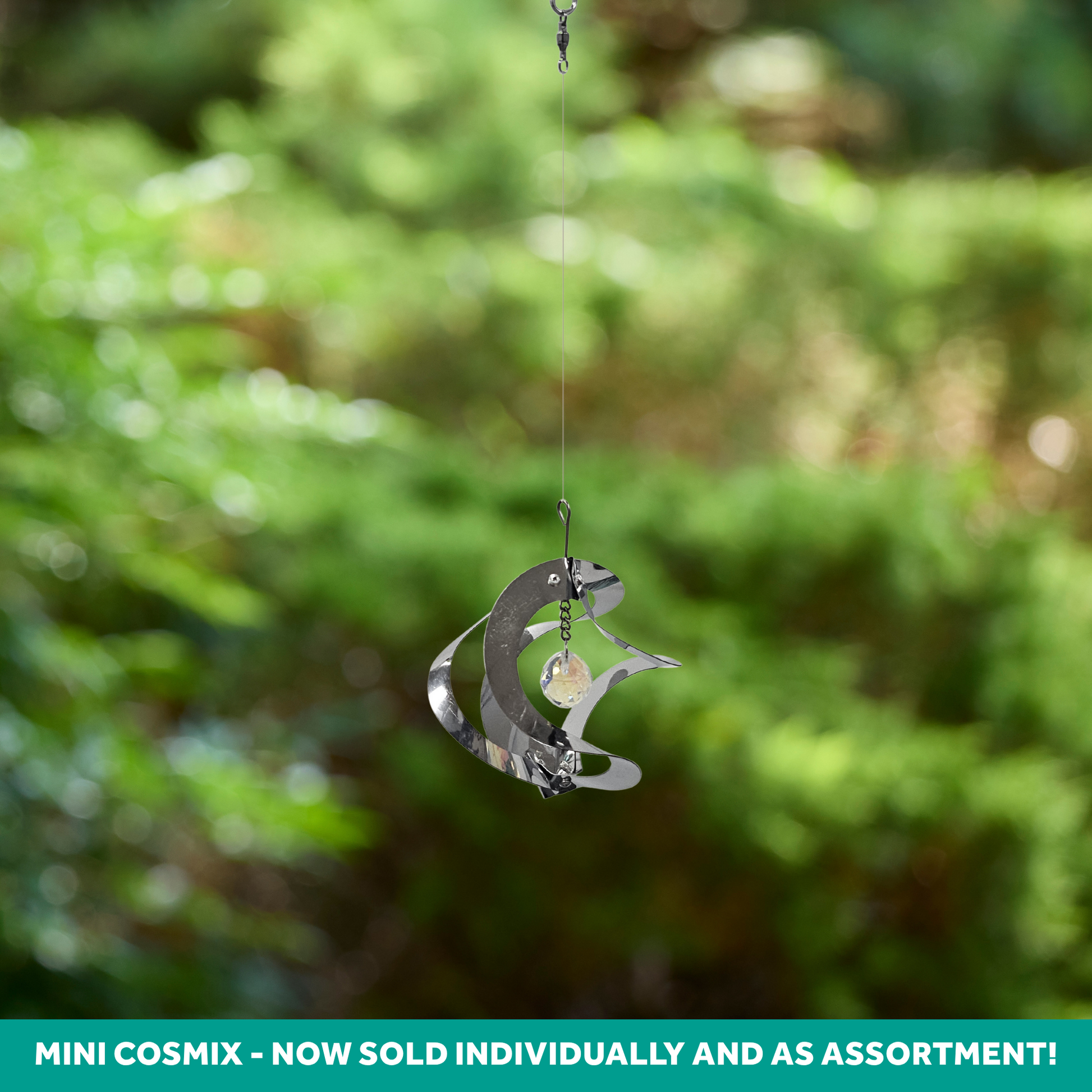 The Chrome Mini Cosmix measures 4″ in diameter and features a prismatic crystal pendant at the center – space-efficient for indoor and outdoor use. The multi-dimensional Cosmix design is a dynamic and modern take on the classic hanging garden spinner.