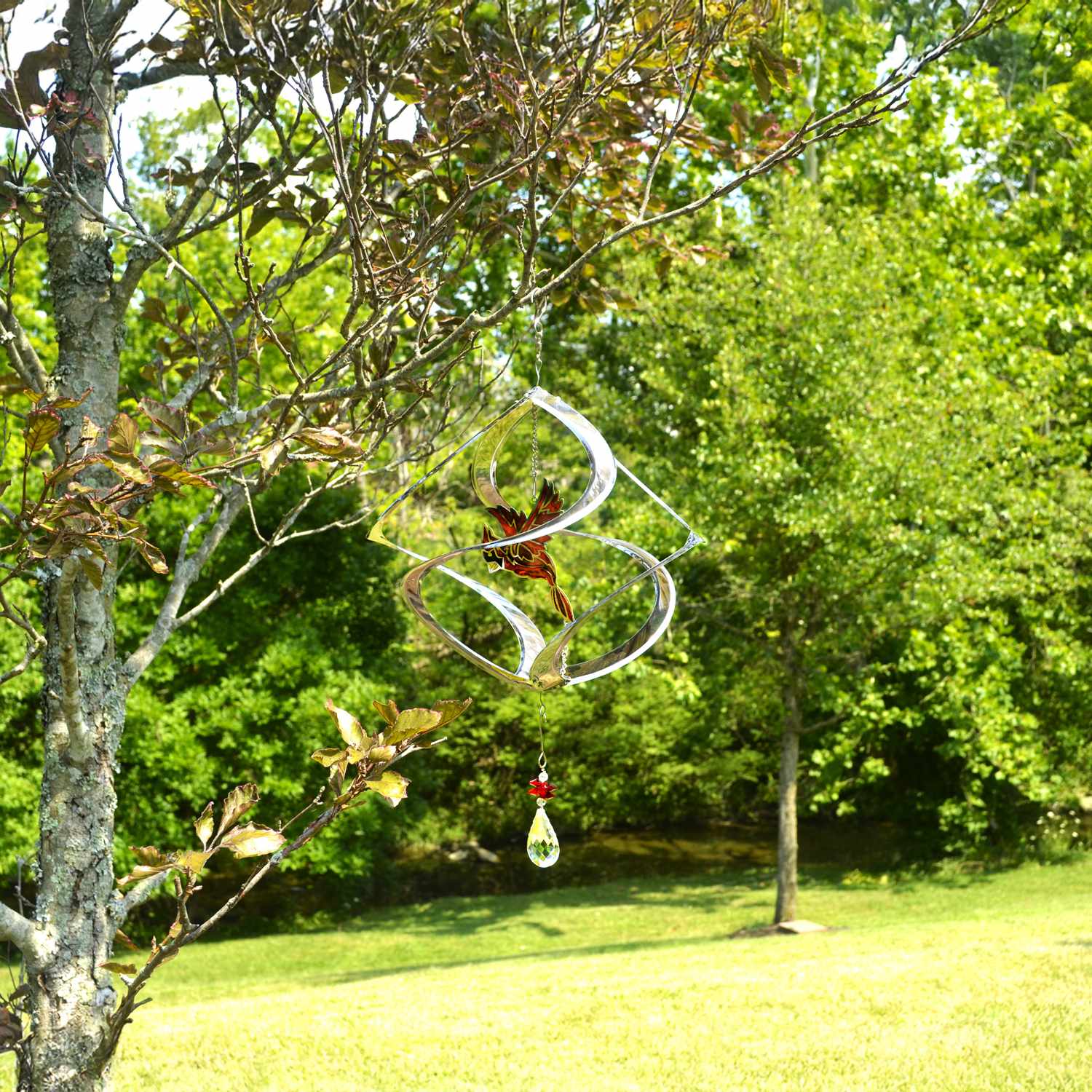 Our Silver Cardinal Cosmix Suncatcher Garden Spinner is a striking statement piece for any outdoor space. Featuring a black and red crystal cardinal at its center, and a prismatic crystal charm at the base, this multi-dimensional design is a dynamic and modern take on the classic garden spinner.