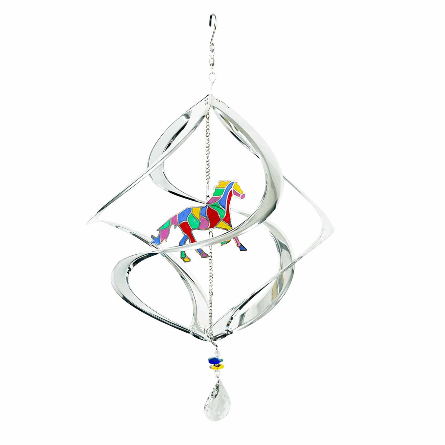 Our Silver Horse Cosmix Suncatcher Garden Spinner is a striking statement piece for any outdoor space. Featuring a rainbow crystal horse at its center, and a prismatic crystal charm at the base, this multi-dimensional design is a dynamic and modern take on the classic garden spinner.