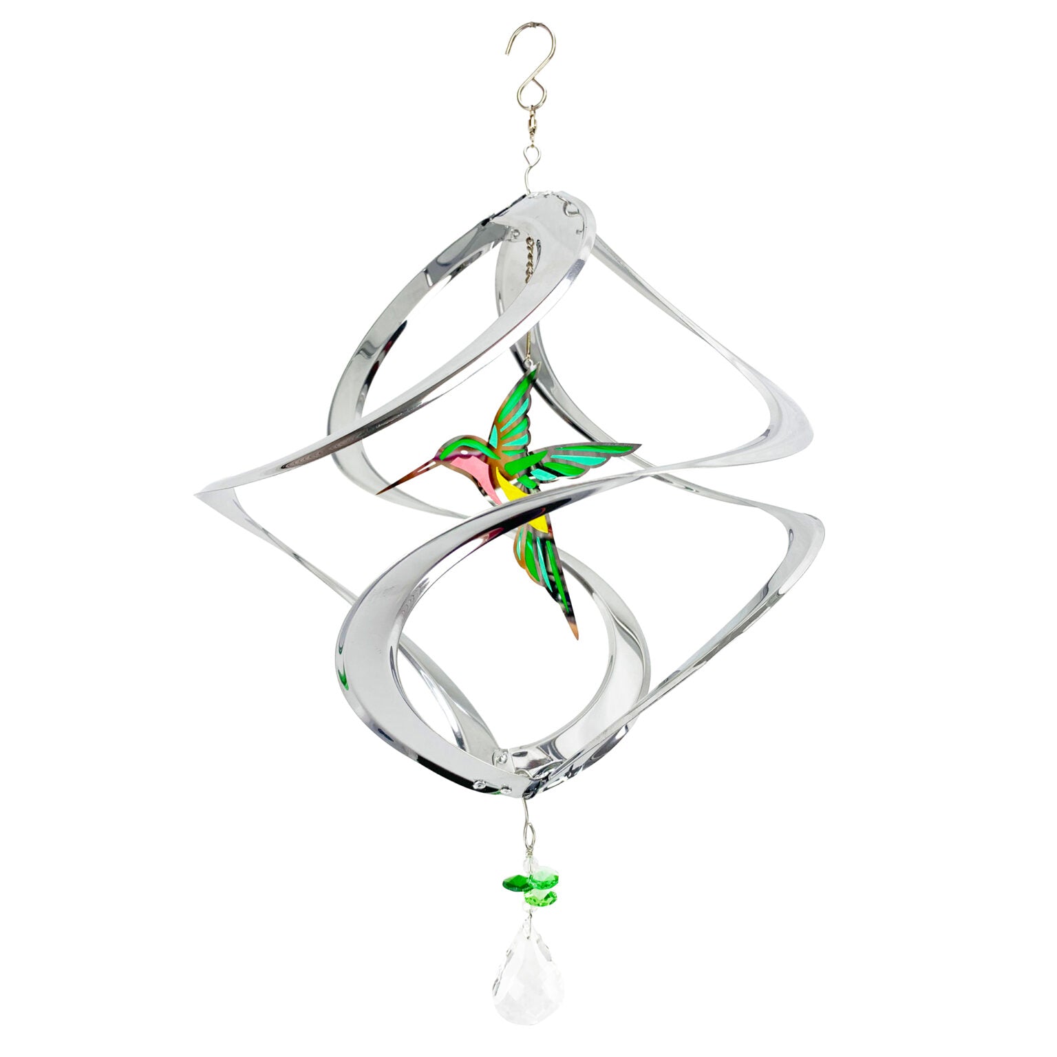 Our Silver Hummingbird Cosmix Suncatcher Garden Spinner is a striking statement piece for any outdoor space. Featuring a green crystal hummingbird at its center, and a prismatic crystal charm at the base, this multi-dimensional design is a dynamic and modern take on the classic garden spinner.